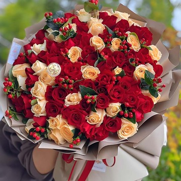 33支香檳玫瑰,66支紅玫瑰,搭配紅豆豐滿間插,裝飾一個(gè)小燈泡(如沒(méi)有用彩燈替換)